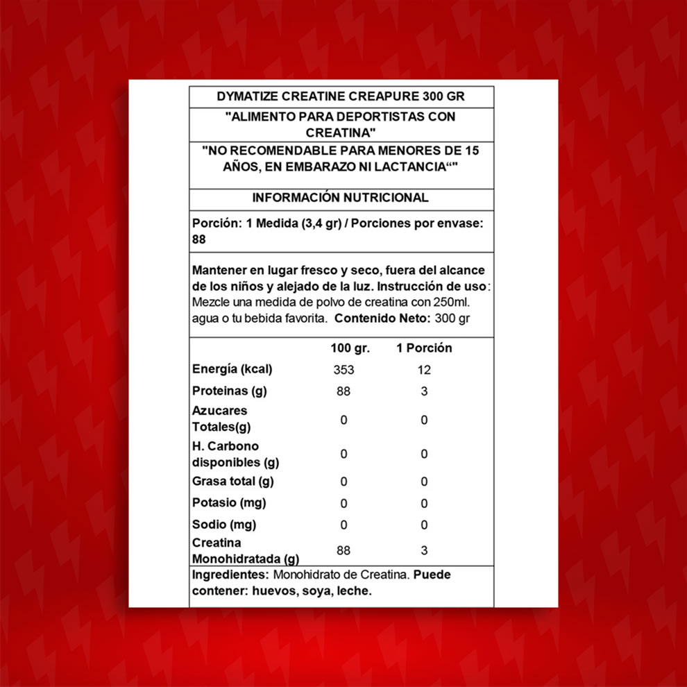 Creatine Micronized Dymatize, es una creatina monohidrata micronizada. Cada envase de 300g rinde 88 porciones, con 3g de creatina monohidrato por scoop. Disponible en sabor neutro, ideal para acompañar con cualquier bebida.